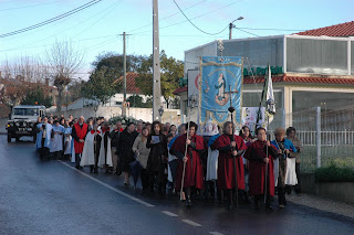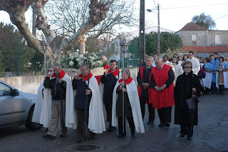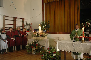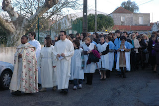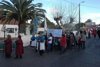 Neste Domingo, bem cedinho, a imagem do Cristo-Sacerdote desceu até à Várzea! A comunidade respondeu ao chamamento e, junto do terreno da futura igreja - mesmo sob a ameaça da chuva - esperaram pela chegada do Bom Pastor, impecavelmente organizados. Um numeroso grupo de crianças da catequese, que durante a Eucaristia iriam deixar junto do altar os seus pedidos devidamente assinados com as suas impressões digitais, seguravam uma faixa onde se lia "Jesus é o Bom Pastor"! Que bela maneira de começar o dia, recebendo-O desta forma tão carinhosa!